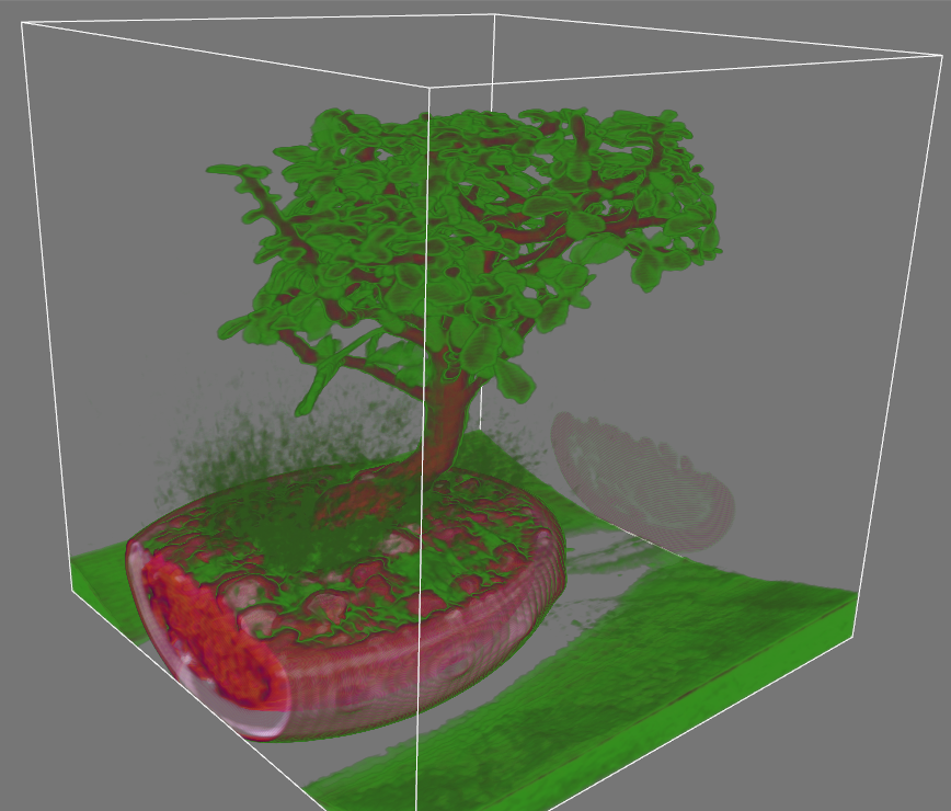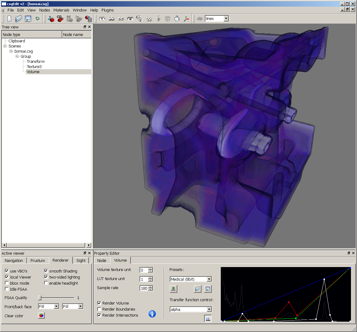 Rendering just axis-aligned slice planes allows to browse through the voxels much like through a flip-book. Though not supported by csgEdit, the renderer naturally supports arbitrary slice planes, too.