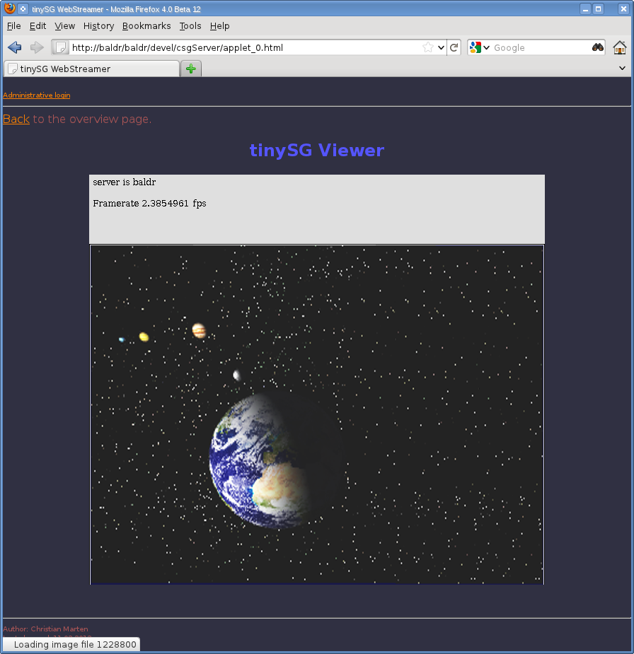 [ Network ] tcpPort = 2970 [ Global ] enableAccessLog = 1 imgMode = raw numModules = 1 numScenes = 1 [ Module_1 ] loaders = "csg,iv" module = tsgStreamerModule.dll renderers = csg [ Scene_1 ] ID = 1 description = "cubes.html" file = cubes.csg loader = csg meta = "tsg" preferedHeight = 240 preferedStreamer = raw preferedWidth = 320 renderer = csg Streaming ClientsSince the communication protocol relies on just sending ASCII commands, clients can be implemented easily on any device that supports TCP/IP networking. The oldest client implementation is a prototype Java Applet that embeds an interactive 3D viewer in any web page. The plugin receives all connectivity data as it's parameters:... <applet code=csgApplet.class width="644" height="580"> <PARAM NAME="port" VALUE="2970"> <PARAM NAME="scene" VALUE="0"> <PARAM NAME="prefStreamer" VALUE="png"> <PARAM NAME="prefWidth" VALUE="640"> <PARAM NAME="prefHeight" VALUE="480"> </applet> ...The Android client is an app that either runs on it's own or plugs into a browser as a helper application. The latter will receive the address and port of the server and connect to a given scene to start streaming. To aid easy development and debugging, there is also a native C++ client that implements a remote viewer as a MDI desktop application, running on Windows and Linux.